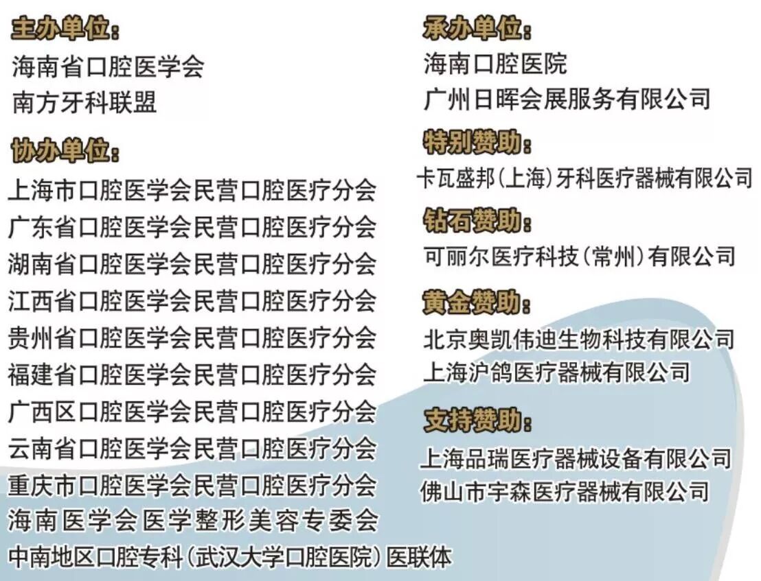 南方口腔醫(yī)學(xué)大會是由南方牙科聯(lián)盟聯(lián)合南方各省口腔協(xié)會在南方各省每年巡回一屆的口腔盛會。大會先后于2013廣東汕頭、2014湖南長沙、2015江西南昌、2016貴州貴陽連續(xù)舉辦,并取得了廣大口腔醫(yī)生及口腔企業(yè)的一致好評。2017年南方口腔醫(yī)學(xué)大會巡回海南,同期舉辦南方牙科聯(lián)盟第五次聯(lián)席會議 、海南省口腔醫(yī)學(xué)會2017年年會、南方牙科聯(lián)盟授牌儀式、2017南方牙科聯(lián)盟青年醫(yī)師根管治療病例大賽及優(yōu)秀病例展評等活動。