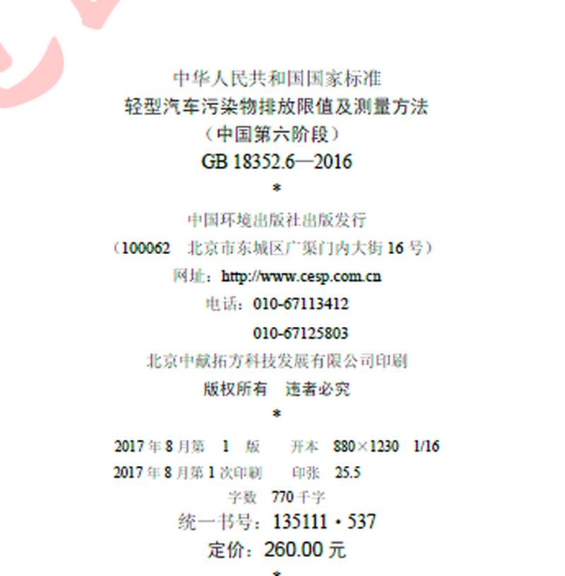 國六標準的全文,有400頁之巨,可在中華人民共和國生態(tài)環(huán)境部官網(wǎng)下載到電子版——如果你有興趣翻到最后一頁,還會發(fā)現(xiàn)這套標準已有書刊號、且印刷出版,定價260元。