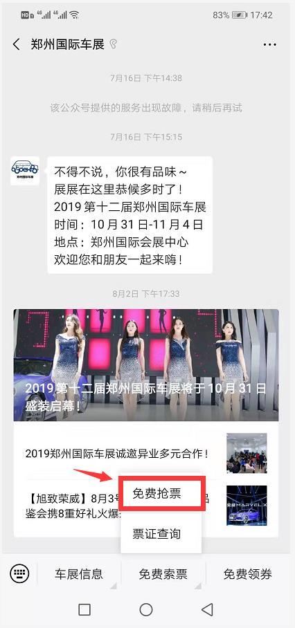1、關(guān)注“鄭州國際車展”官方微信,選擇菜單欄“免費索票”,點擊“免費搶票”;